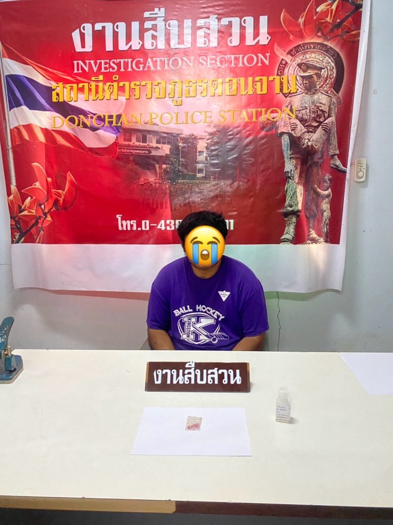 งานสืบสวน สภ.ดอนจาน 21 ม.ค. 2568 เวลาประมาณ 11.00 น. อำนวยการจับกุมโดย พ.ต.อ.สรกฤช ราชภักดี ผกก.สภ.ดอนจาน พ.ต.ท.ชูชาติ ด้วงคำจันทร์ รอง ผกก.สภ.ดอนจาน พ.ต.ท.วิภาช สุระอุดร สว.สส.สภ.ดอนจาน รายนามเจ้าพนักงานผู้จับกุม ร.ต.อ.สุวิทย์ ภูตะวัน รอง สว.สส.สภ.ดอนจาน, ร.ต.ต.กฤษณพงษ์ วงศ์ธรรม ด.ต.สามารถ ภาคพะชัย ส.ต.อ.จักรกฤษณ์ พงษ์ปลัด ส.ต.ท.รัชกาล ญาณพิพัฒน์ จับกุมผู้ต้องหา 2 ราย ดังนี้
